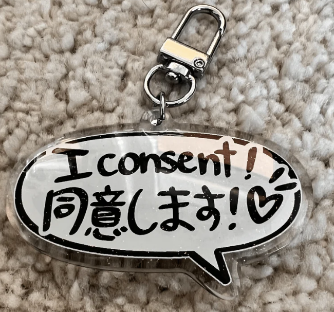 Q. Your artwork prominently features "I Consent!" with each post, and you also sell acrylic charms with the phrase (above). What's the story behind this, and how does it relate to your BDSM content?