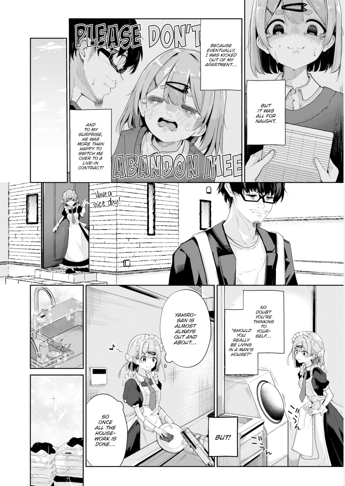 It takes thirteen pages before the titular Koharu-chan pops her—well—tits out, but for this story, that's brilliantly paced. We learn that Koharu is a live-in maid who's struggled to keep work until—rather down on her luck—she stumbled upon Yahiro-san. Bereft of parents and (tear-jerker) stuck with their large family home (oh no, how terrible), Koharu keeps things spick-and-span while Yahiro slaves away as a corporate drone.