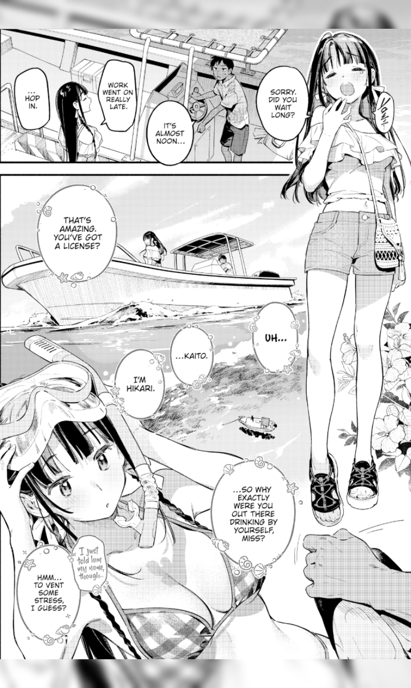 But her new life doesn't meet all her expectations. To offset her thoughts, she takes to wandering the beach late at night with a drink or two to pass the time. One day, her drunk venting causes her to fall off a breakwater, where a passing angler named Kaito rescues her. That little interaction sparks their friendship, a friendship so uninvested that the two rarely even call each other by their name. But when Hikari and Kaito take a day trip to a secluded beach, their relationship jumps from the platonic to the intimate.